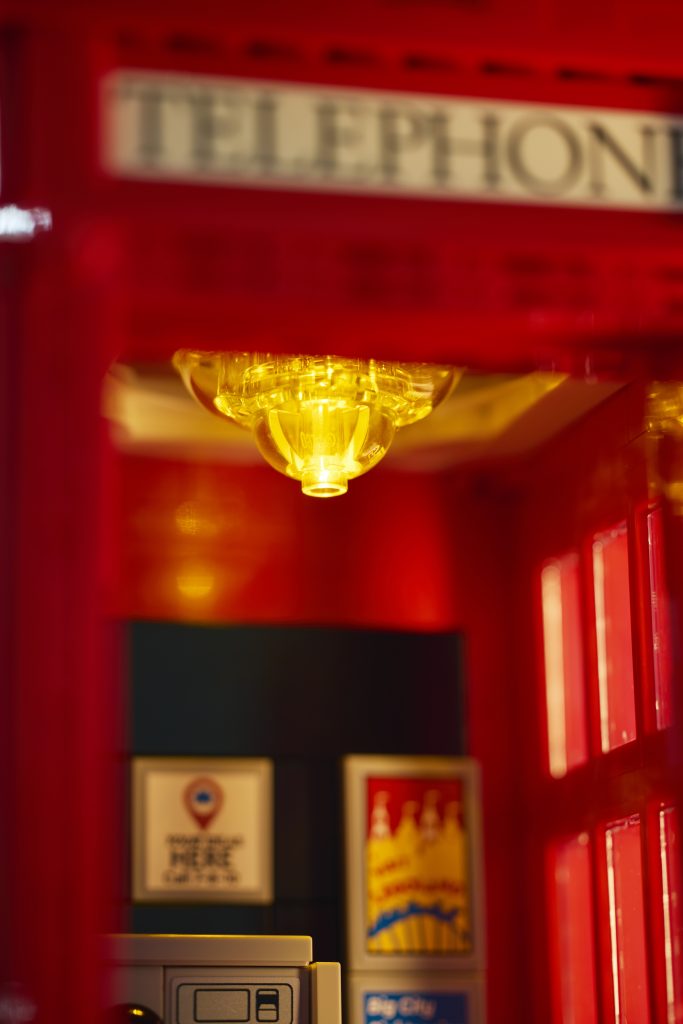 Innen 21347 Rot London Telefonzelle, es gibt einen Lichtstein, der für eine warme Beleuchtung des Inneren der Telefonzelle sorgt und Ihre Gespräche beleuchtet, während Sie trocken bleiben von der klassisch London Wetter – es regnet meistens.