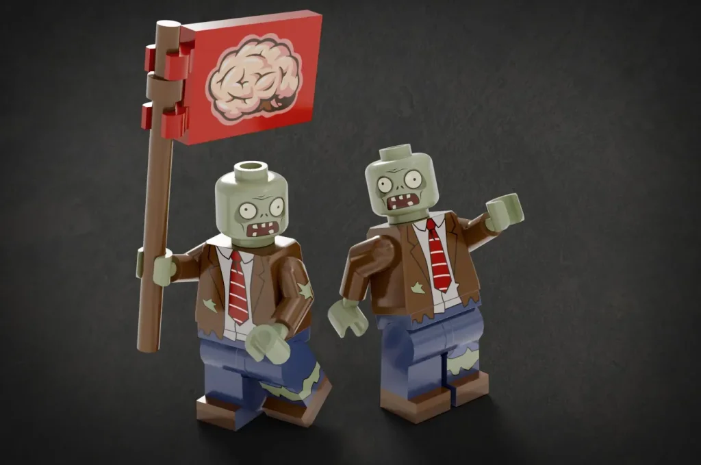 Auf der Zombie-Seite der Dinge, die LEGO Ideas Der Beitrag enthält vier untote Minifiguren, darunter drei Browncoats und einen Flaggenzombie mit der typischen Gehirnflagge. „Plants vs. Zombies – Diorama“ ist als eigenständiges Ausstellungsset konzipiert, kann aber auch als Rasenbrett zum Spielen verwendet werden, zusätzlich gibt es ein Zen-Garten-Minispiel als Bonus.