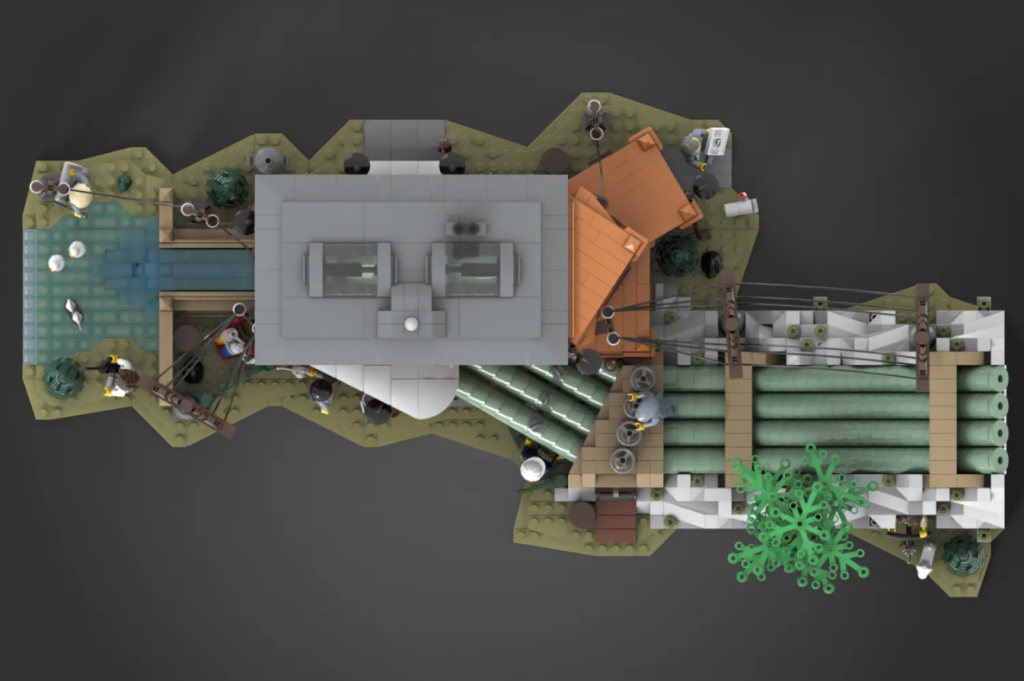 Darüber hinaus ist das LEGO Ideas Der Beitrag umfasst einen Bergabschnitt mit einem Baum und einem Tunnel sowie einen Wasserauslass, der in einen nahe gelegenen Fluss mündet, außerdem Minifiguren von vier Fabrikarbeitern, einem Sicherheitsinspektor, einem Radfahrer mit einem Hund und einem Teenager mit einem Spielzeugboot.