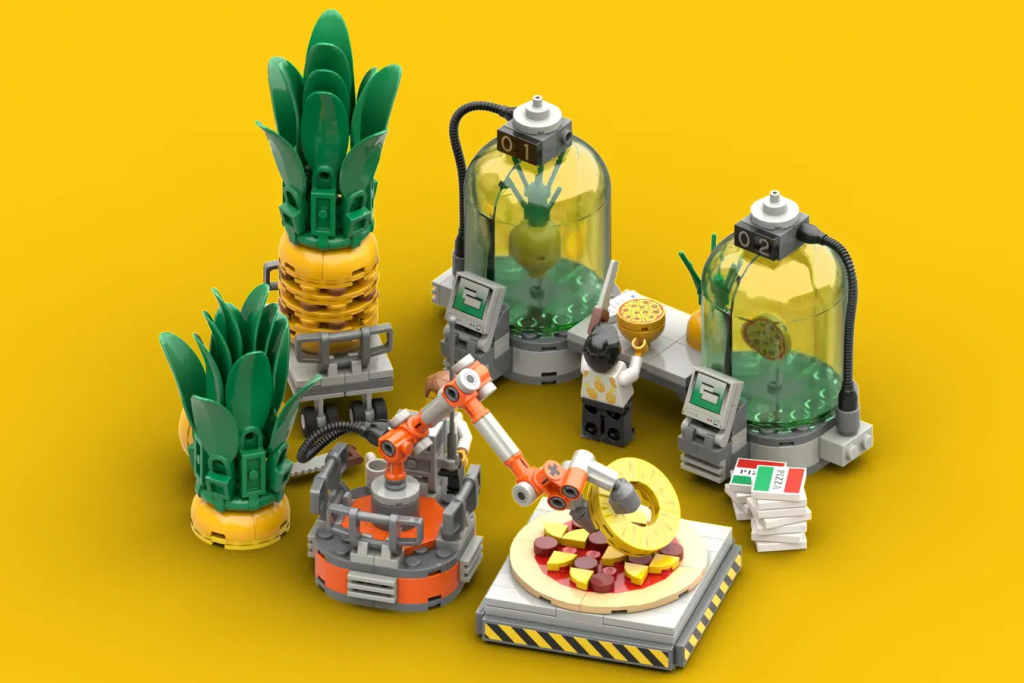 Doch als Hauptpreisträger des LEGO Ideas Die Super Science Challenge ist das Ananas-Pizza-Projekt. Das vom Fandesigner ShaolinFoldingChair entworfene Modell stellt eine Welt dar, in der ein Kult von Extremisten eine Maschine geBauen hat, um die schlimmste aller möglichen Pizzasorten herzustellen: Ananas.