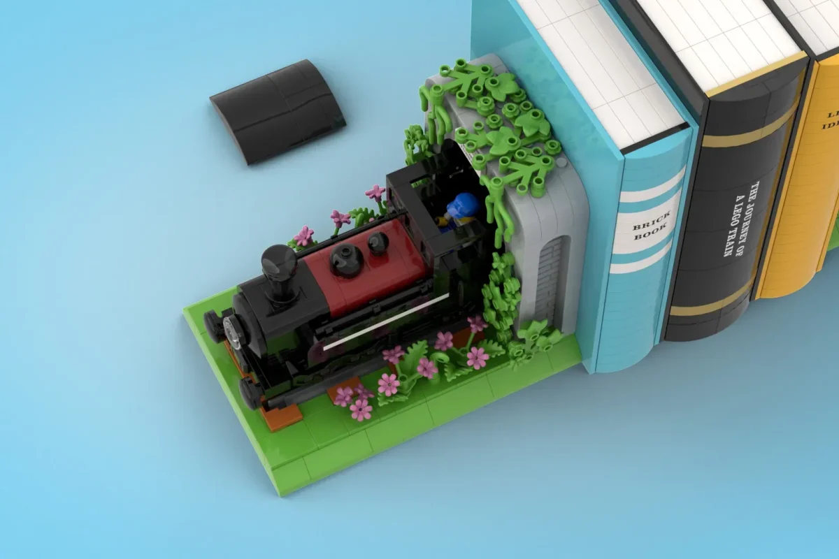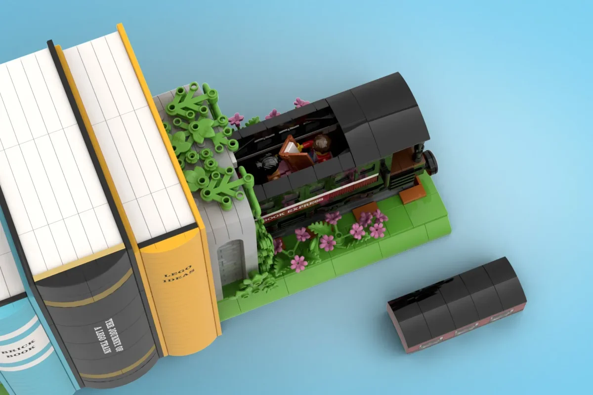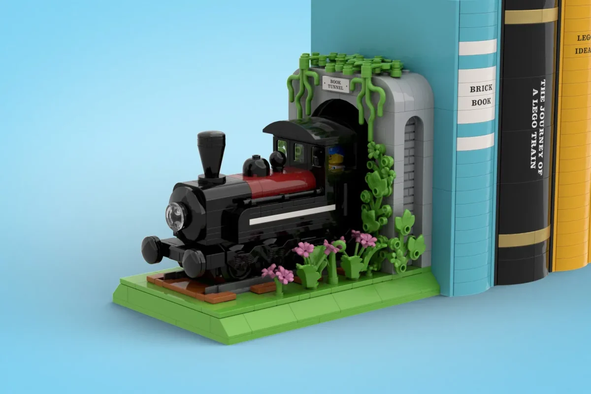 Das aus 1,636 Teilen bestehende Modell ist so gestaltet, dass es wie eine Dampflokomotive aussieht, die durch einen Tunnel zwischen drei Büchern fährt – eine Illusion, die hervorragend funktioniert. Sowohl der Zug als auch der dazugehörige Waggon verfügen über … klassisch Das Design besteht hauptsächlich aus schwarzen und kastanienbraunen Teilen, wobei üppiges Grün die grauen Tunnelöffnungen umgibt.
