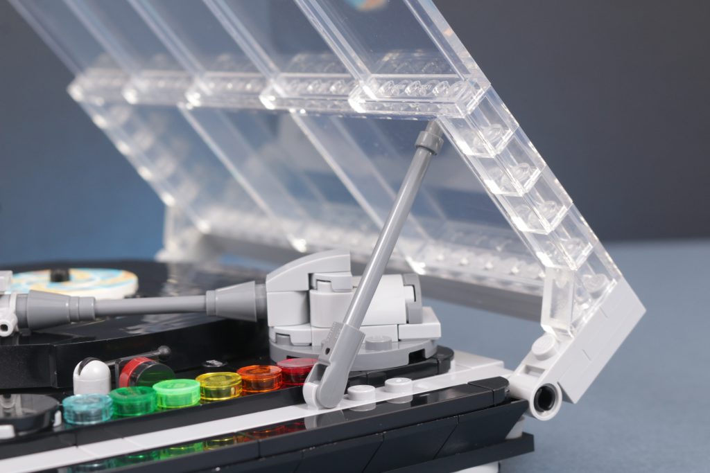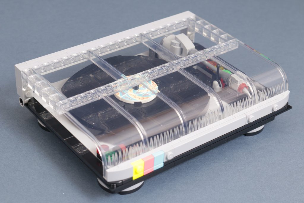 So sehr die transparenten Elemente und die Formgebung des Retro-Plattenspielers 40699 auch zu seiner tollen Optik beitragen, lässt seine Funktionalität zu wünschen übrig. Es gibt viele interaktive Elemente, die Sie mehrmals umschalten und drehen müssen, aber die Hauptfunktion des GWP besteht darin, die Schallplatte realistisch zu drehen. Das funktioniert zwar, aber ein geeigneter Mechanismus zum Drehen, ohne hinter die Konstruktion greifen zu müssen, wäre eine spannende Ergänzung gewesen.