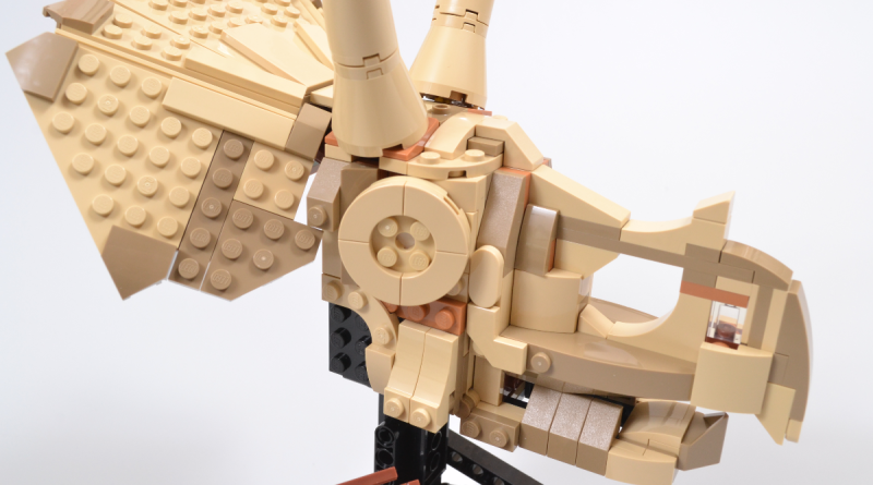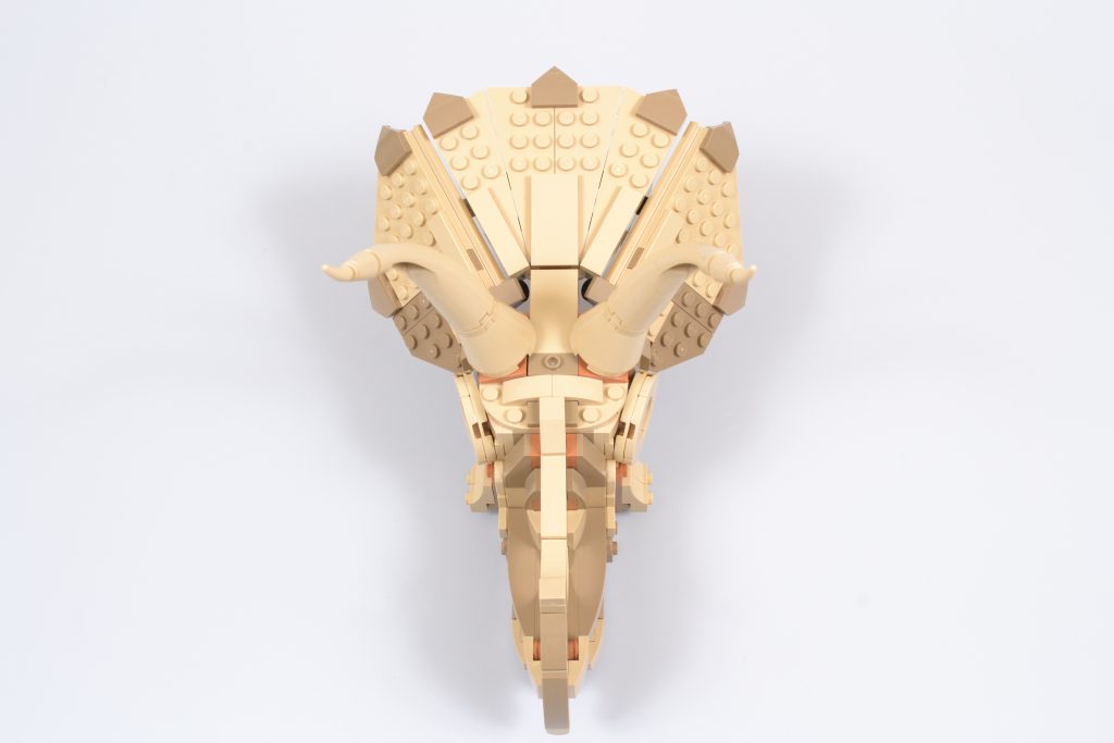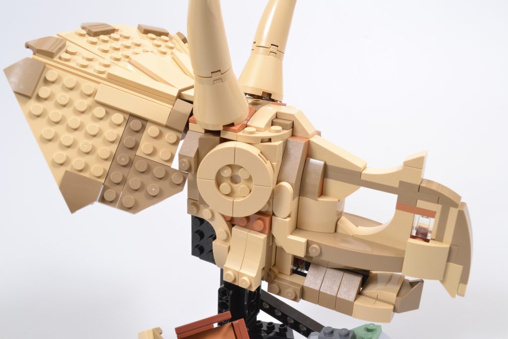 Interessanterweise befindet sich an der Rückseite des Triceratops-Schädels eine Hälfte eines scheinbar zufälligen 2×2-Stücks mit großem Kugelgelenk, das fast dazu gedacht zu sein scheint, das Modell an eine maßstabsgetreue Version des restlichen aus Steinen geBauenen Skeletts des dreihörnigen Tieres anzubringen. Doch selbst mit jüngste Gerüchte in Bezug auf das T. Rex-Skelett Nr. 76968: Wer sind wir, dass wir darüber spekulieren, wozu dieses spezielle Teil letztendlich da sein könnte …