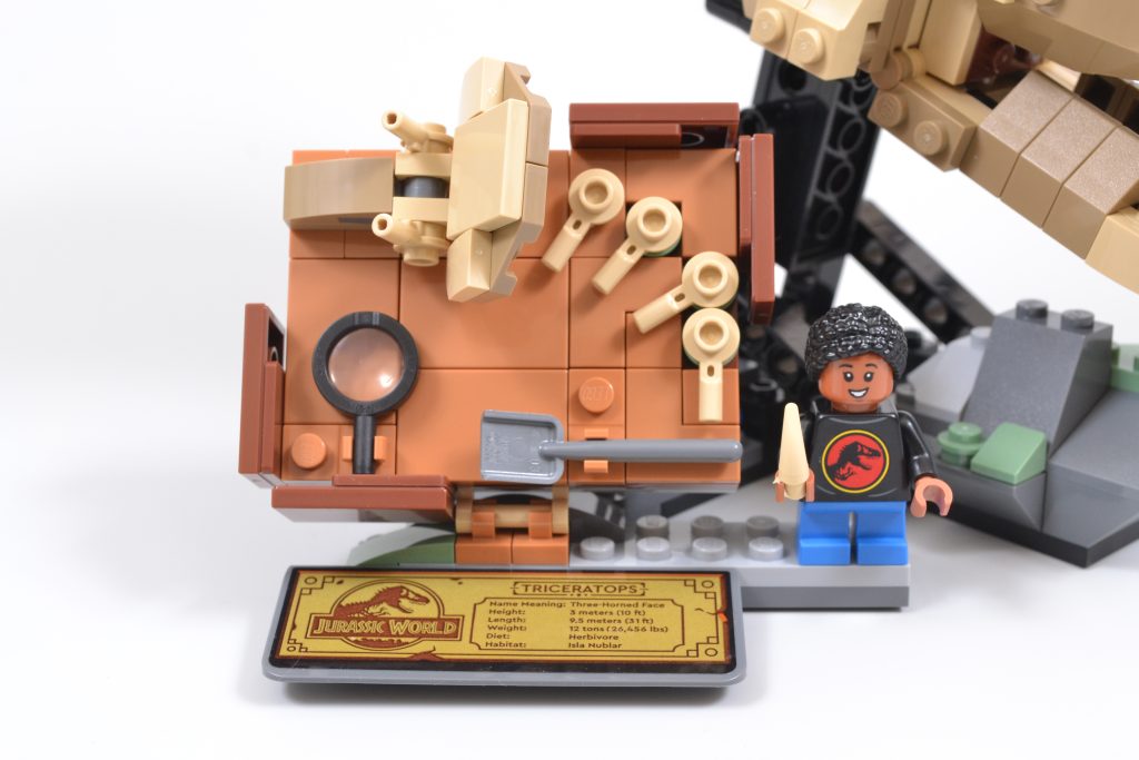 Anstelle des versteinerten Fußabdrucks, der in 76964 Dinosaurierfossilien: T. Rex-Schädel, 76969 Dinosaurierfossilien: Triceratops-Schädel stattdessen erhält man eine abgewinkelte, aus Ziegeln geBauene Platte einer archäologischen Ausgrabungsstätte, komplett mit einem winzigen Triceratops-Skelett sowie Lupe und Spaten-Ausgrabungswerkzeug. Die Beigabe einer aufgeklebten Informationstafel ist der einzige Bereich, der die Gesamtästhetik leicht beeinträchtigt, aber das ist ein kleiner Kritikpunkt an einem ansonsten tollen Ausstellungsstück.