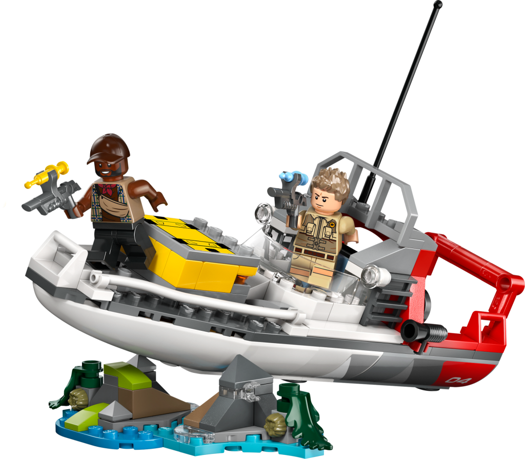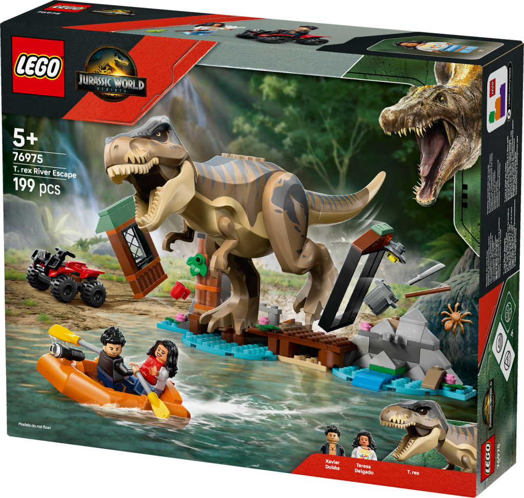 Die LEGO Group hat seine geformten T. rex-Dinos normalerweise für größere und teurere Jurassic World und Jurassic Park-Sets, aber 76975 T. Rex – Flucht aus dem Fluss widersetzt sich dem Trend. Es ist das günstigste Set seit dem 2020 T. Rex Dinosaur Breakout aus dem Jahr 76944 (und inflationsbereinigt das bisher günstigste Set), das diese T. Rex-Form enthält. Außerdem sind ein kleines Gebäude am Flussufer, ein Schlauchboot, ein Quad sowie Minifiguren von Xavier Dobbs und Teresa Delgado enthalten.