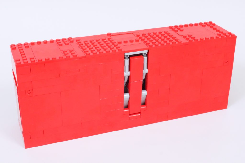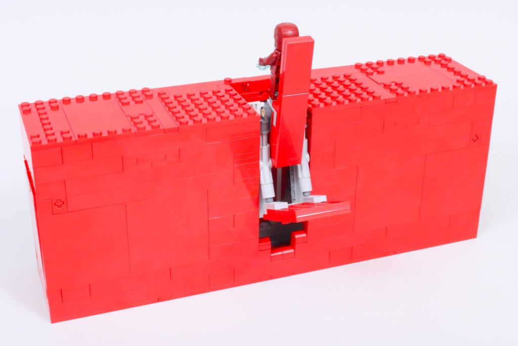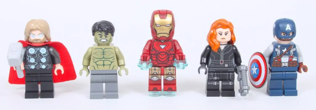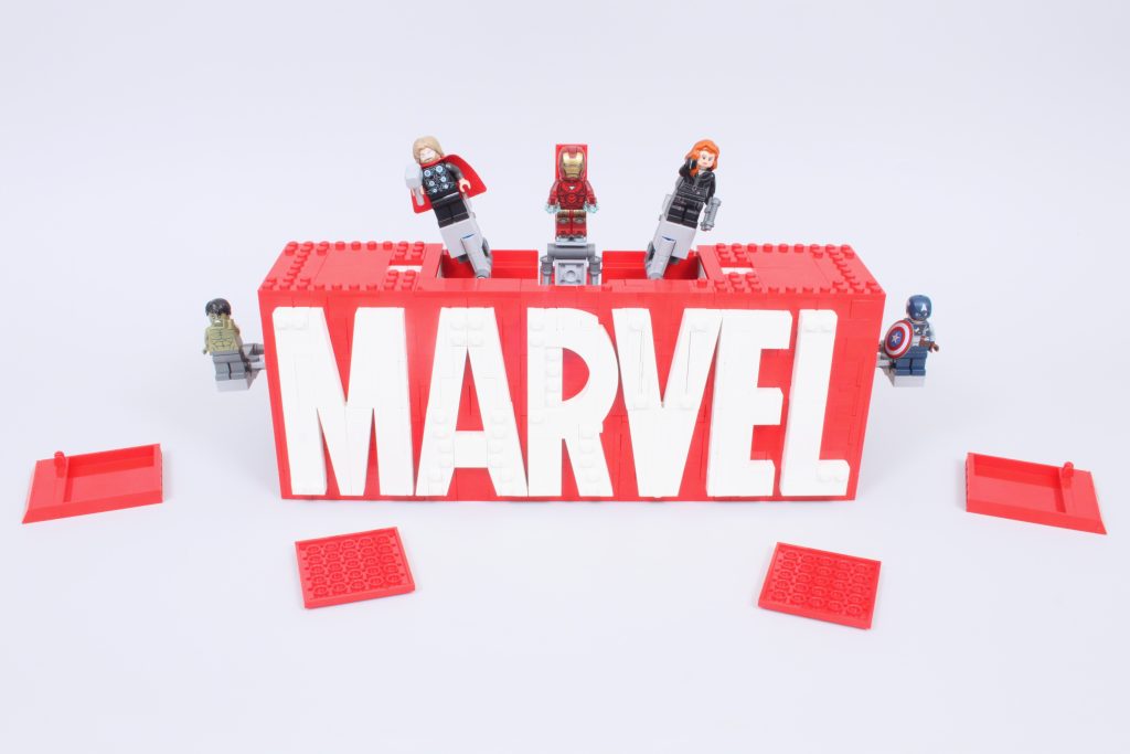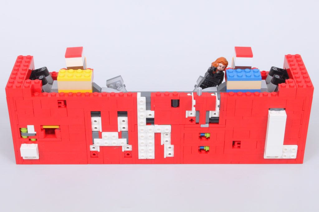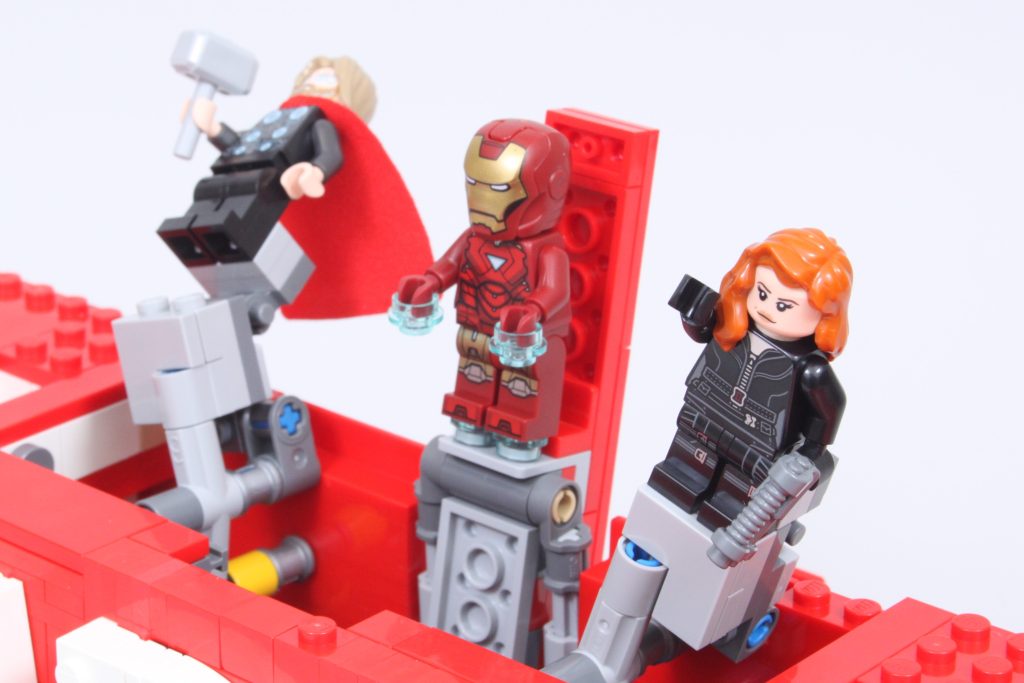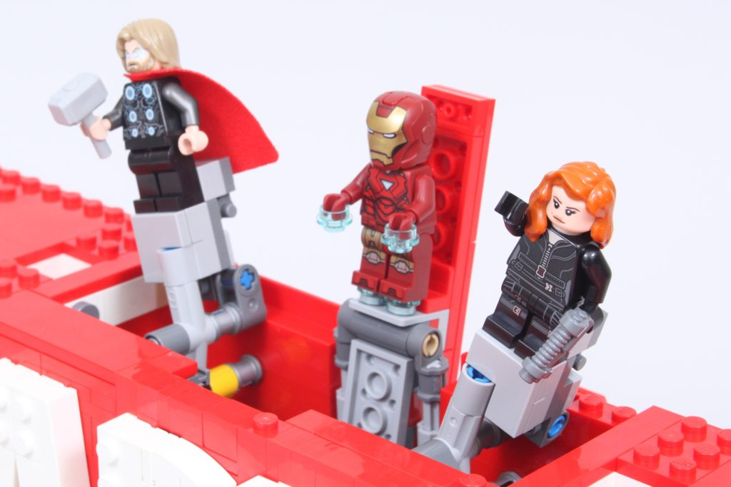 Die fünf begehrenswerten Minifiguren decken die meisten der ursprünglichen Avengers ab, leider fehlt aber Hawkeye – trotz des Preises von 89.99 £ / 99.99 $ / 99.99 €. Sechs Minifiguren für die sechs Buchstaben des Logos wären ideal gewesen, aber es ist nicht ganz genug Platz, um einen Mechanismus für eine sechste Minifigur in das Logo einzubauen. Der Mechanismus, der im Inneren enthalten ist, ist eine komplexe Konstruktion, die nach dem Zusammenbau gut funktioniert.