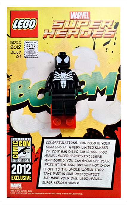 Bisher wurde nur eine einzige solche Minifigur veröffentlicht, und zwar als exklusives Sammlerstück der San Diego Comic-Con, das 2012 auf der Popkulturveranstaltung verschenkt wurde. Spider-Man Sein schwarzes Symbiontenkostüm war nur in streng limitierter Stückzahl über eine Werbeaktion verlost worden und ist bis heute nicht in größerem Umfang erhältlich, was es auf dem Gebrauchtmarkt zu einem teuren Kauf macht.