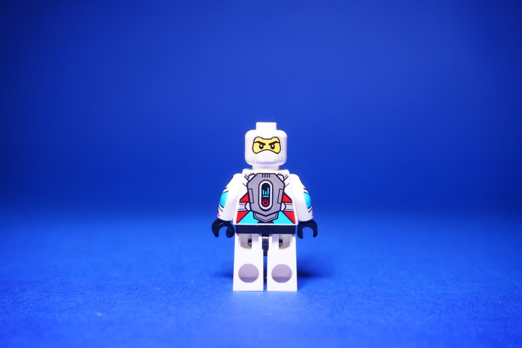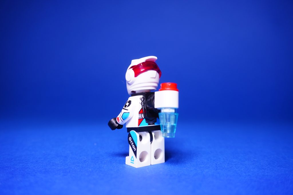 Der Helm ist ein wirklich beeindruckendes Stück. Er ist doppelt geformt und weist in der Mitte einen transparenten roten Streifen auf, der das Grinsen des Jetpack Racers im Tony Stark-Stil gut sichtbar macht. Der Aufdruck auf dieser Minifigur ist rundum hervorragend – das Octan-Sponsoring an der Seite seiner Beine ist eine nette Geste –, aber der Jetpack Racer wird durch sein eigentliches Jetpack etwas enttäuscht, das etwas zu weit aus seinem Körper herausragt, um sich angenehm anzufühlen.