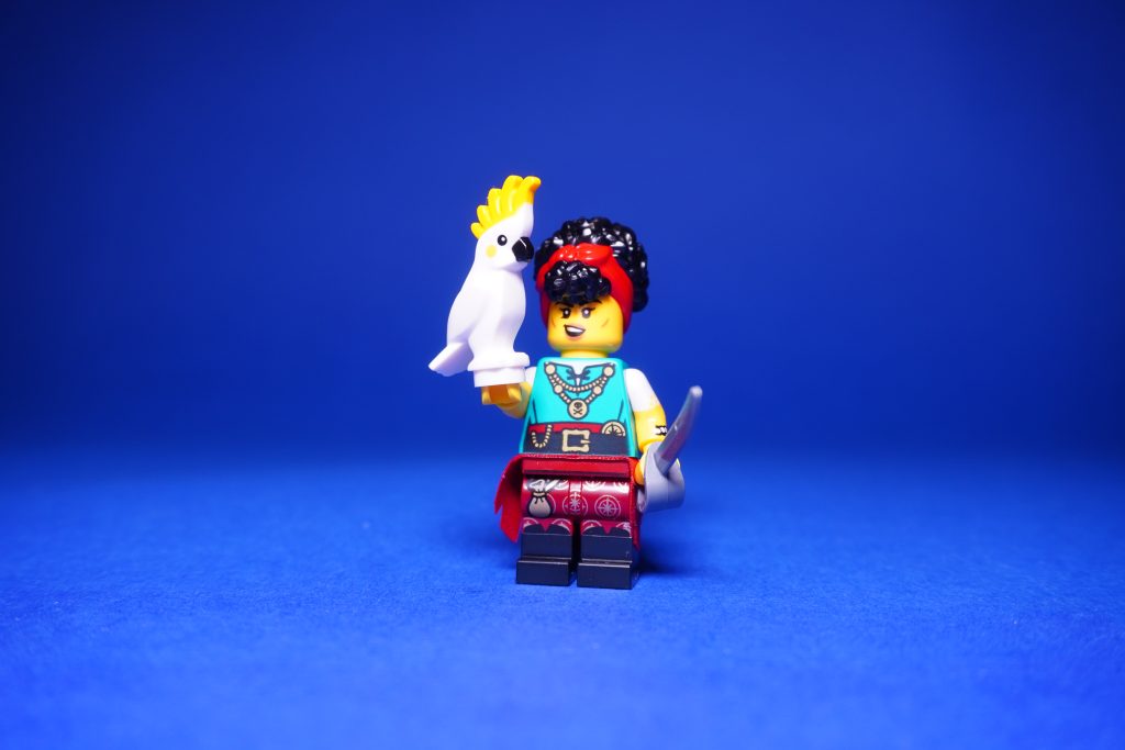 Die Minifigur wird mit einem zerfetzten Stoffrock geliefert, der, wie so oft, etwas knifflig anzubringen ist. Nach dem Anbringen bauscht er sich aber schön auf und verleiht dem Piraten-Quartiermeister eine markantere Silhouette. Während das Entermesser des Quartiermeisters das gleiche Design aufweist wie seit den Anfängen von LEGO Pirates, ist der interessantere Bestandteil dieser Box der Kakadu, ein neues, individuelles Element, das mit einer gelben Federbüschel auf dem Kopf entzückend aussieht.