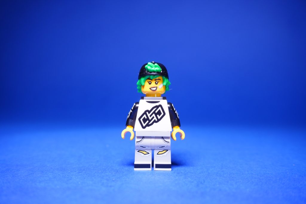 Das Highlight dieser Minifigur ist jedoch vielleicht ihre verkehrt herum getragene Kappe, an deren Unterseite und Vorderseite leuchtend grüne Stachelhaare hervorschießen, um den kantigen Skater-Look der Minifigur wirklich hervorzuheben.