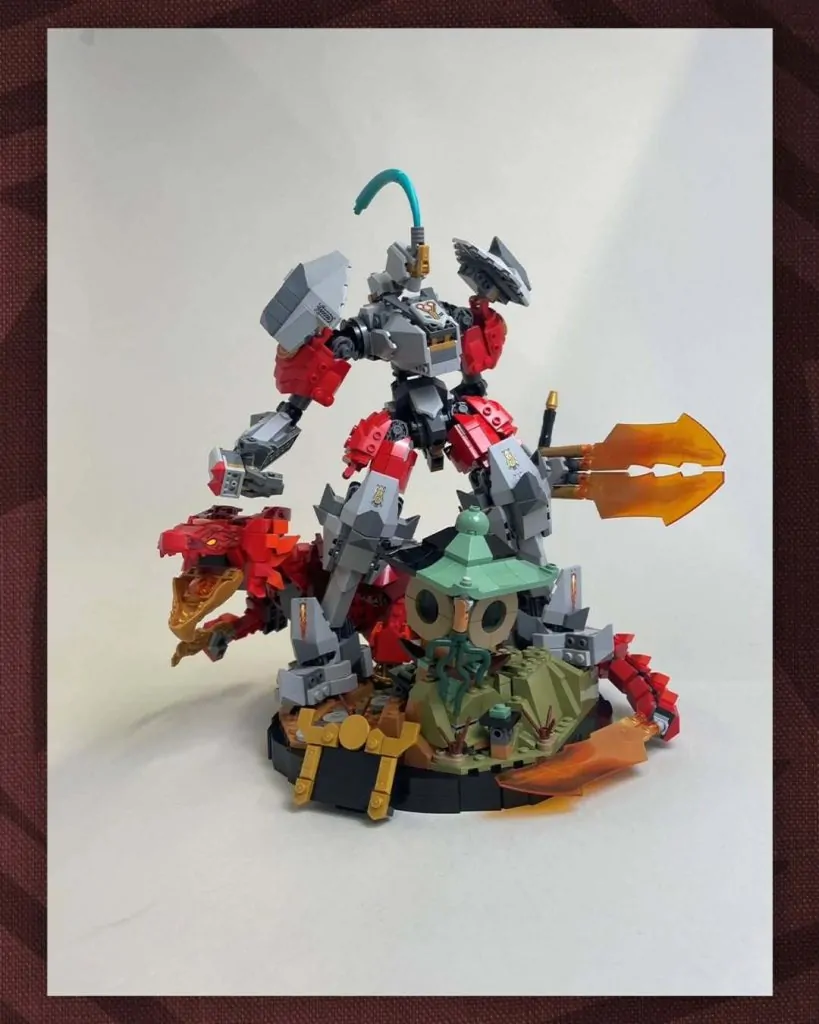 Das 996-teilige 71846 Der Feuerritter-Mech zeigt einen Mech, der über einer monströsen Kreatur schwebt. Dieses Konzept begleitete den gesamten Designprozess. Die genaue Form der Basis und das Layout des Monsters haben sich erheblich verändert. An einer Stelle wurde eine Reihe von Wellen und Spritzern vorgeschlagen, die jedoch für die endgültige Version abgeschwächt wurden.