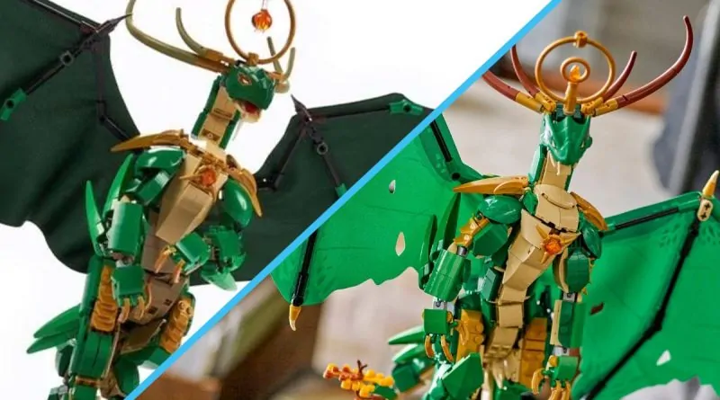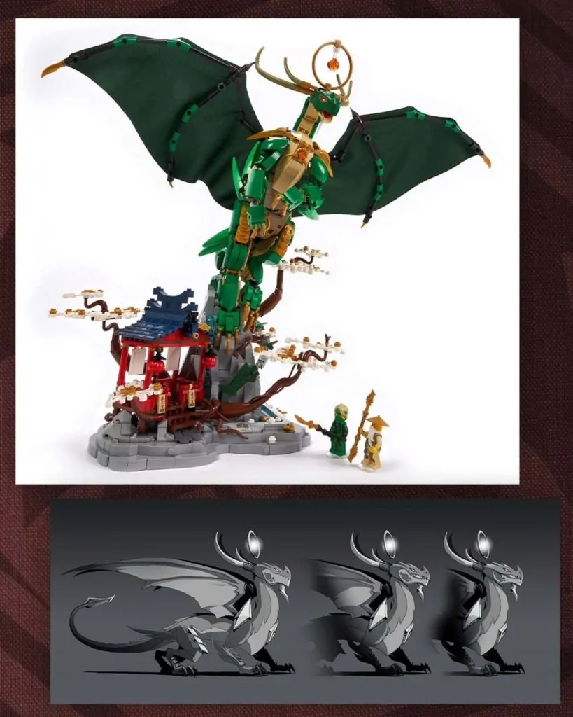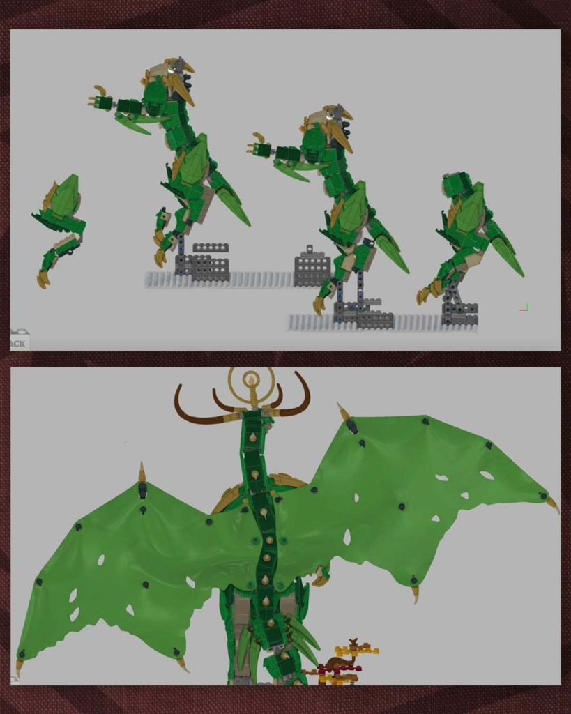 Die größere, 1,650-teilige 71847 Der Wächterdrache Vom Konzept bis zum finalen Design hat sich vieles verändert, doch eines ist gleich geblieben: der riesige grüne Drache mit ausgebreiteten Flügeln. Der Rest des Modells hat sich während der Entwicklung deutlich verändert.