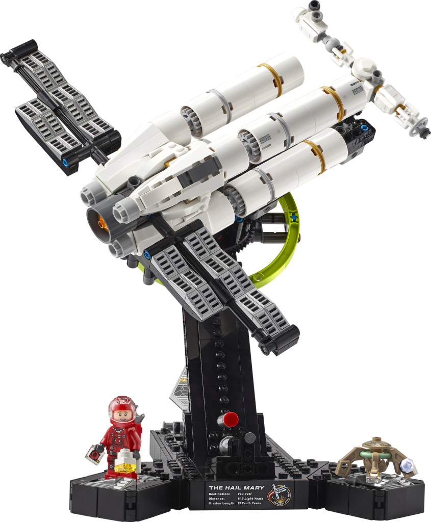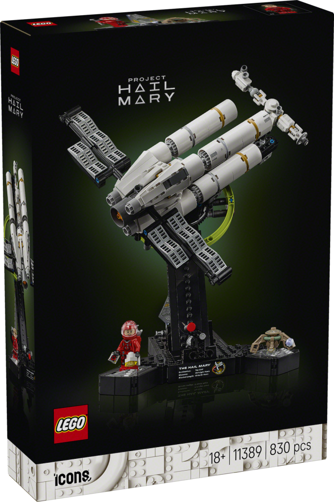 11389 Projekt Hail Mary Die Box enthält ein 830-teiliges Miniaturmodell des titelgebenden Raumschiffs aus der Geschichte, eine Minifigur von Ryland Grace (im Film gespielt von Ryan Gosling) und eine baubare Rocky-Figur. Damit wird zwar eine der (mehreren) Wendungen des Romans verraten, aber der Filmtrailer hat ja schließlich dasselbe getan.