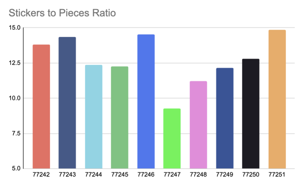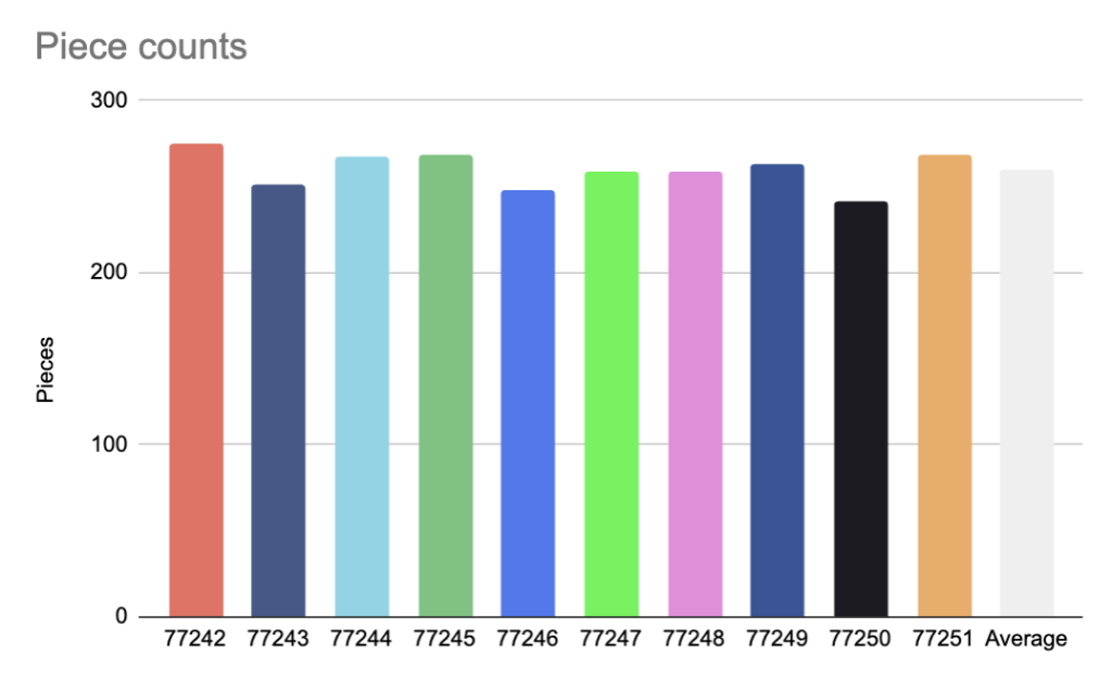 Betrachtet man die Gesamtzahl der Teile – die einzige Möglichkeit, die Größe zu beurteilen, da jedes Auto die gleiche Höhe, Breite und Länge hat –, gibt es keine großen Unterschiede. Wir haben den Durchschnitt in einem letzten Balken am Ende aufgeführt, um einen Eindruck zu vermitteln, aber obwohl einige in Bezug auf die Stückzahl deutlich kleiner oder größer sind, beträgt der Unterschied zwischen dem größten und dem kleinsten nur 33 Teile. 77242 Ferrari SF-24 F1 bei 275 und 77250 MoneyGram Haas F1 Team VF-24 bei 242.