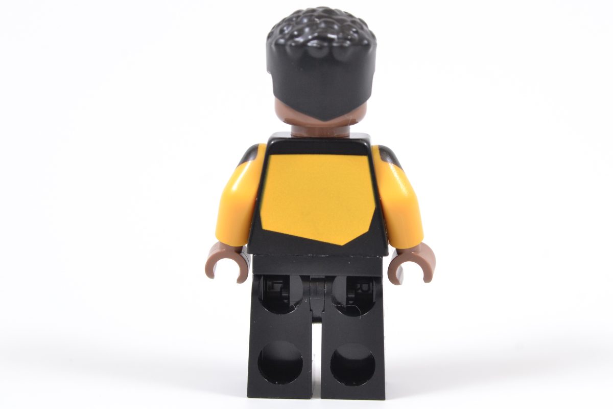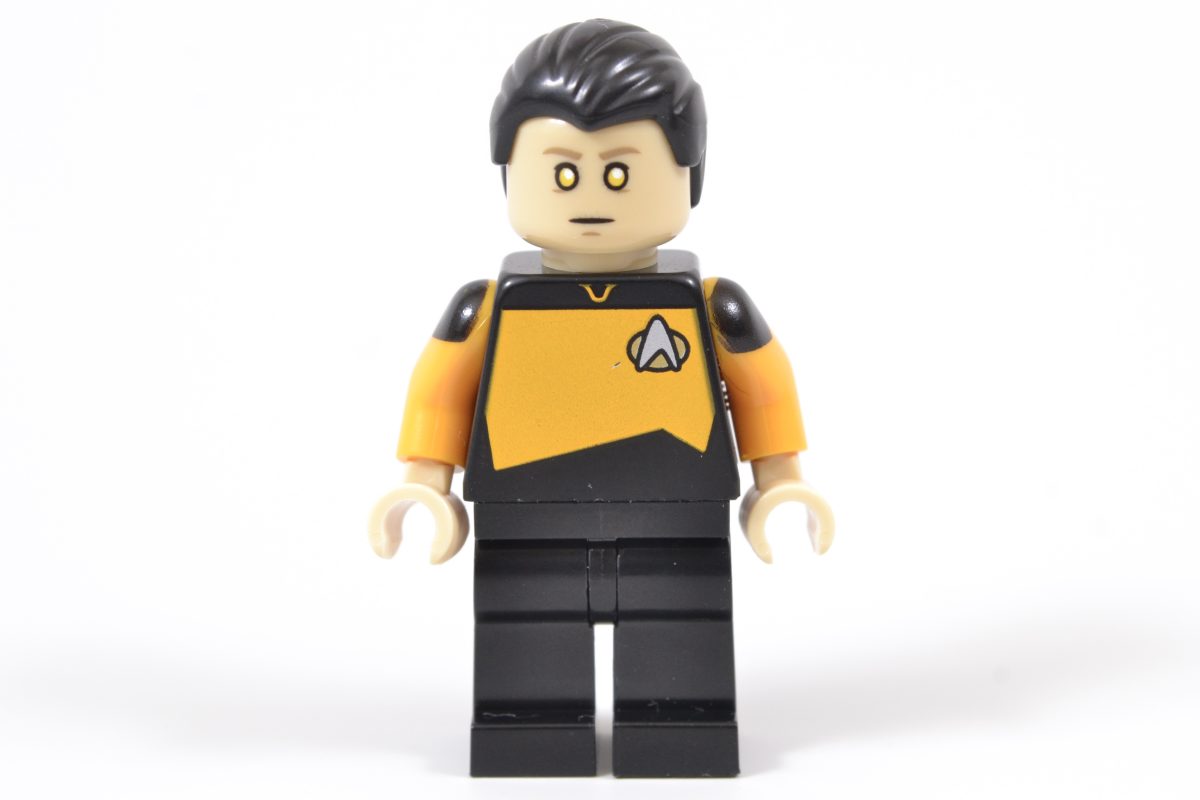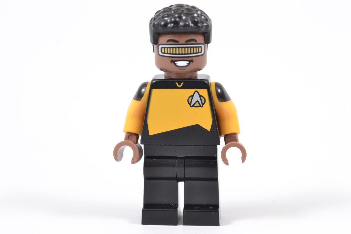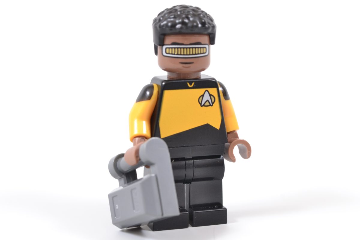 Eine der herausragendsten Minifiguren des LEGO Star Trek Sets ist der Chefingenieur des Schiffs, Lieutenant Commander Geordi La Forge. Sein Kopf ist beidseitig bedruckt und zeigt sein VISOR-Gerät sowie einen Sternenflotten-Ingenieurkoffer. Wie alle Mitglieder der Operations-, Technik- und Sicherheitscrew trägt Geordi eine gold-schwarze Uniform. Die Farben an seinem Oberkörper wirken in natura jedoch eher gelblich, während die Arme einen leichten Orangeton aufweisen.