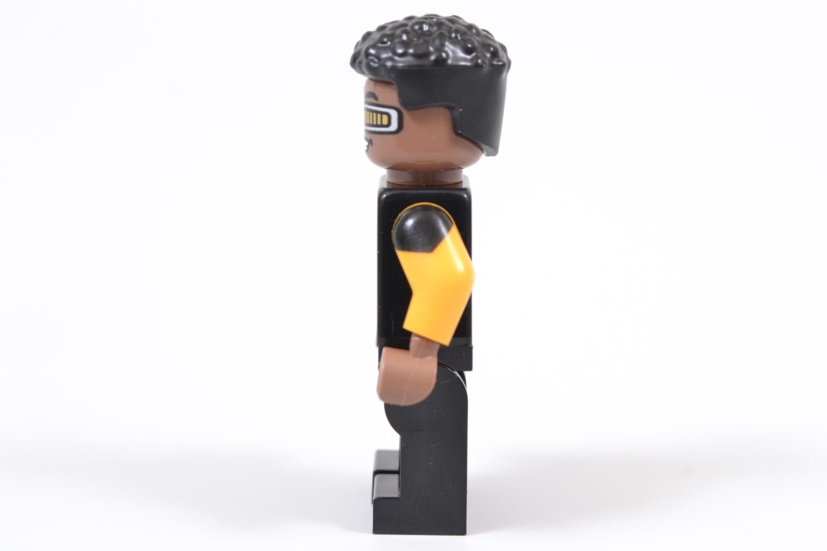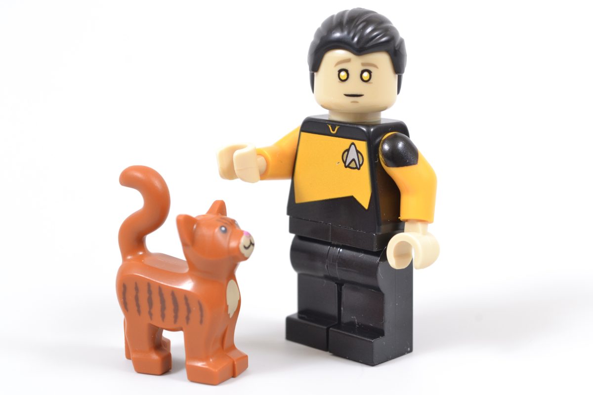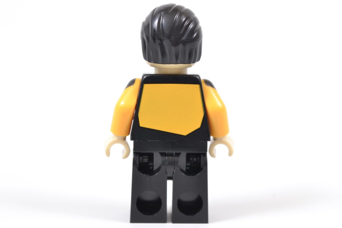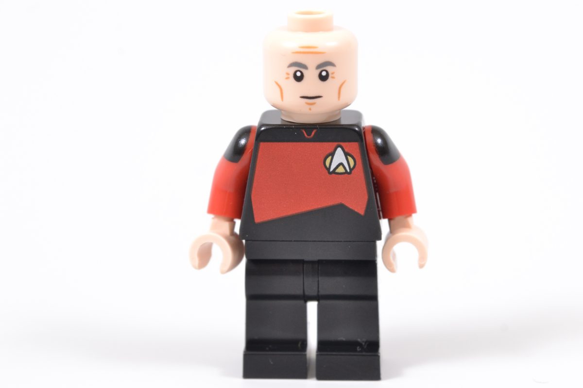 Eine der herausragendsten Minifiguren des LEGO Star Trek Sets ist der Chefingenieur des Schiffs, Lieutenant Commander Geordi La Forge. Sein Kopf ist beidseitig bedruckt und zeigt sein VISOR-Gerät sowie einen Sternenflotten-Ingenieurkoffer. Wie alle Mitglieder der Operations-, Technik- und Sicherheitscrew trägt Geordi eine gold-schwarze Uniform. Die Farben an seinem Oberkörper wirken in natura jedoch eher gelblich, während die Arme einen leichten Orangeton aufweisen.