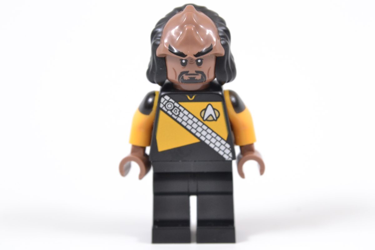 Als nächstes kommt Lieutenant Worf, ein weiteres Highlight des LEGO Star Trek Sets, vor allem dank seines brandneuen, zweifach gegossenen Kopfes und Haarteils, das die knöchernen Stirnwülste der Klingonen perfekt wiedergibt. Neben dem beidseitig bedruckten Kopf verfügt Worfs gold-schwarze Uniform über seinen silbernen Schultergurt und eine traditionelle klingonische Schärpe, die über einer Schulter getragen wird. Der Sicherheitschef der Enterprise ist außerdem mit einem bedruckten 1x1-Schrägphaser Typ 2 ausgestattet.