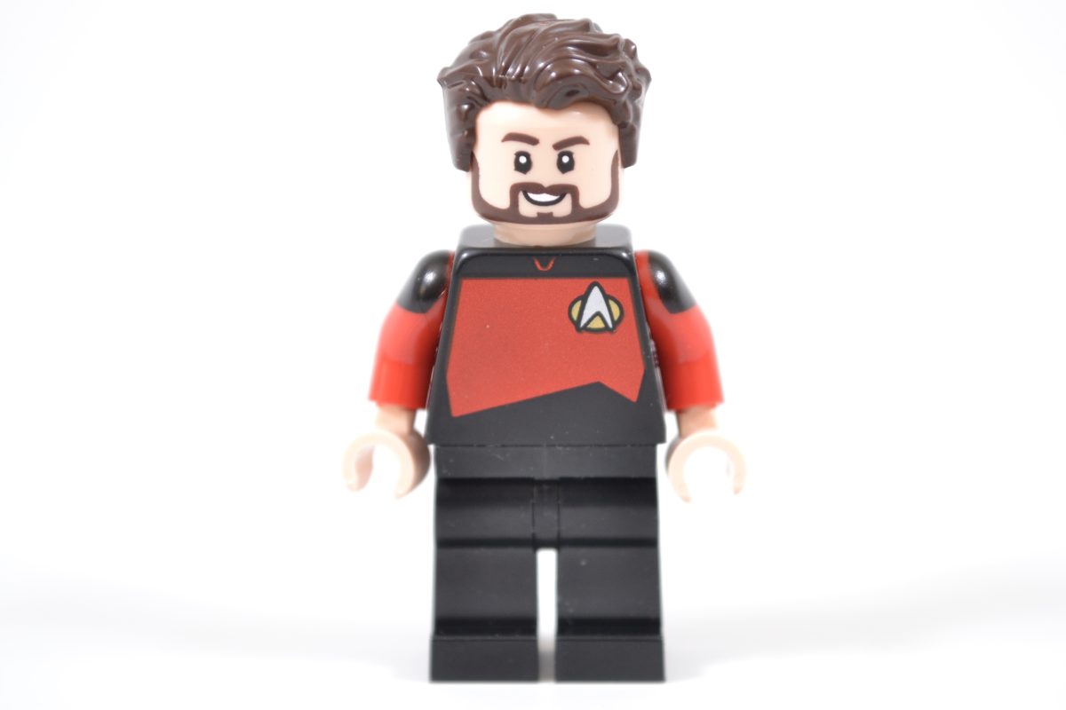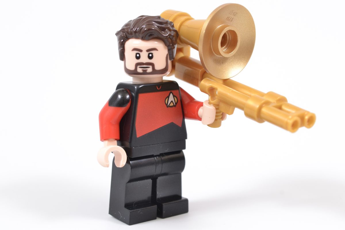 Picards treuer Erster Offizier trägt dieselbe schwarz-rote Uniform wie sein Captain (inklusive ähnlicher Farbabweichungen) und verfügt über zwei verschiedene Gesichtsausdrücke. Commander William Riker kommt außerdem mit der allerersten aus LEGO® Steinen geBauenen Posaune in verschiedenen Goldtönen. Das Instrument hat sogar einen eigenen Ständer, falls mal keine spontanen Subraum-Jazz-Sessions anstehen.