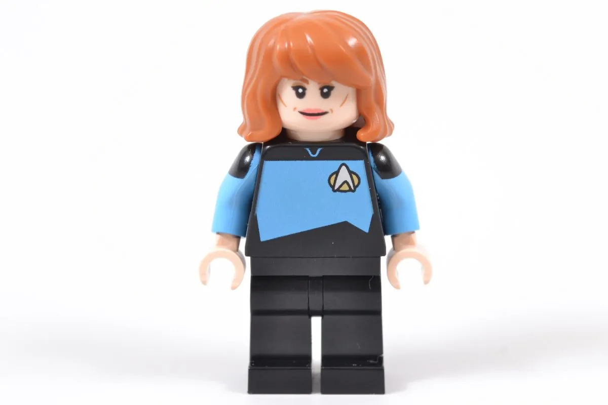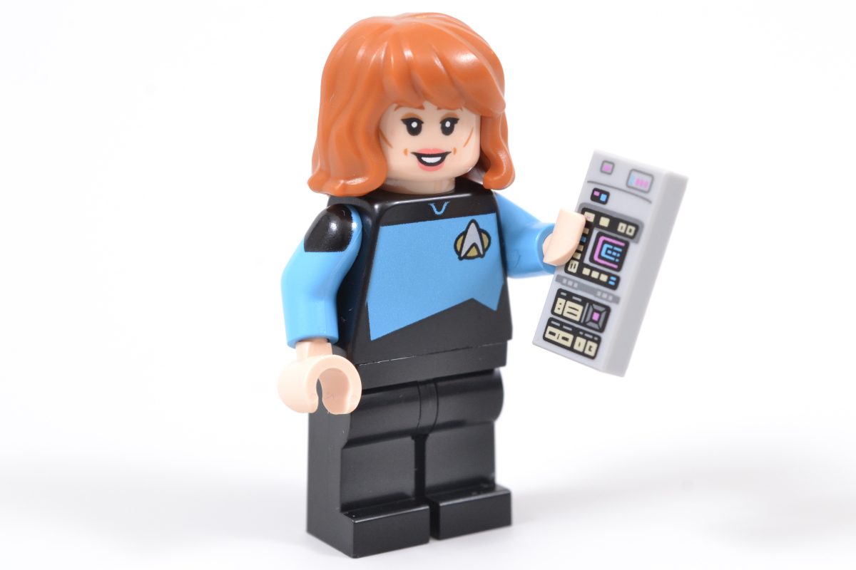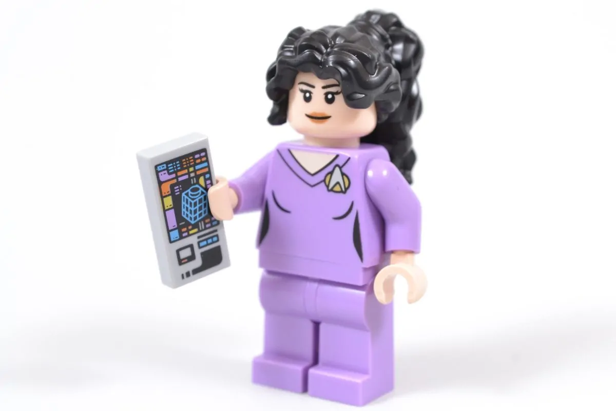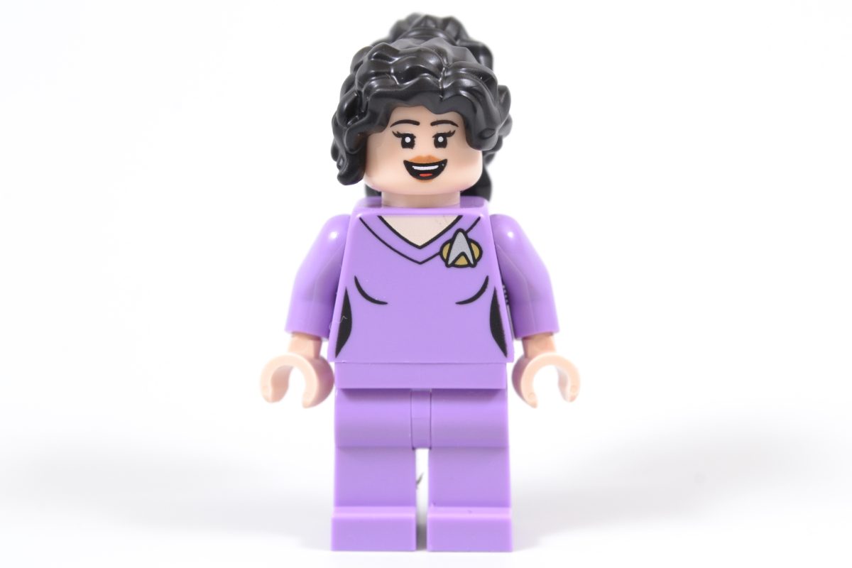 Die Schiffsberaterin Deanna Troi ist anwesend und trägt einen lila-fliederfarbenen Jumpsuit mit V-Ausschnitt, wie man ihn hauptsächlich in der zweiten und dritten Staffel der Fernsehserie sieht. Der Betazoid hat außerdem ein neues schwarzes Haarteil, zwei verschiedene Gesichtsausdrücke und ein bedrucktes PADD (Personal Access Display Device) mit einer lustigen Abbildung eines LEGO-Steins.