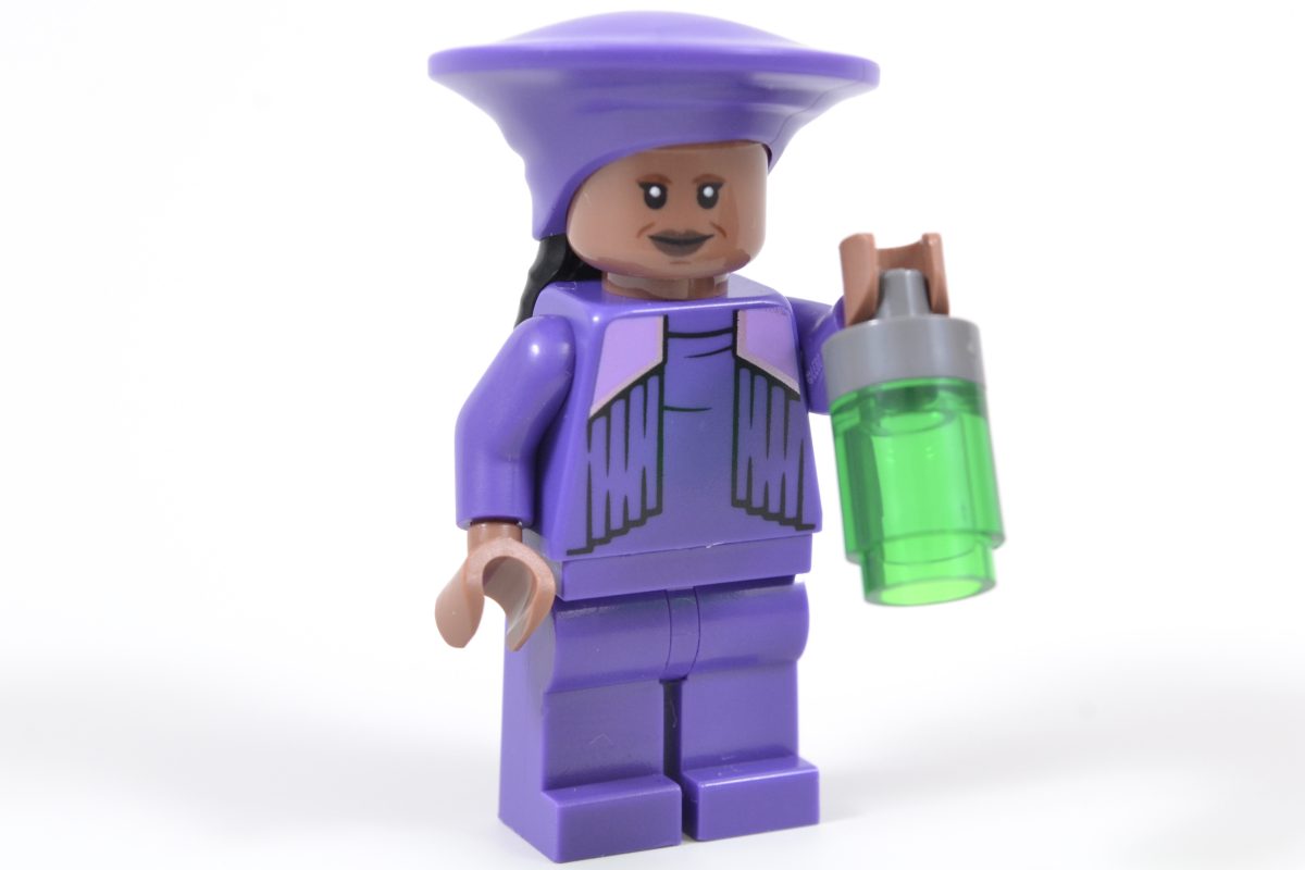 Ein weiterer bei den Fans beliebter Charakter aus Star Trek: The Next Generation ist ebenfalls im LEGO-Set enthalten. Icons Das Set enthält die geheimnisvolle Barkeeperin Guinan. Wie Worf und Deanna ist auch die Ten-Forward-Barkeeperin die einzige weitere Minifigur mit einem komplett neuen Element: ihrem zweiteiligen Hut und Haarteil. Der Oberkörper der Figur ist beidseitig bedruckt, ihr Kopf ist ebenfalls doppelseitig bedruckt und sie kann eine grüne Flasche Aldebaran-Whisky ohne Synthehol halten.