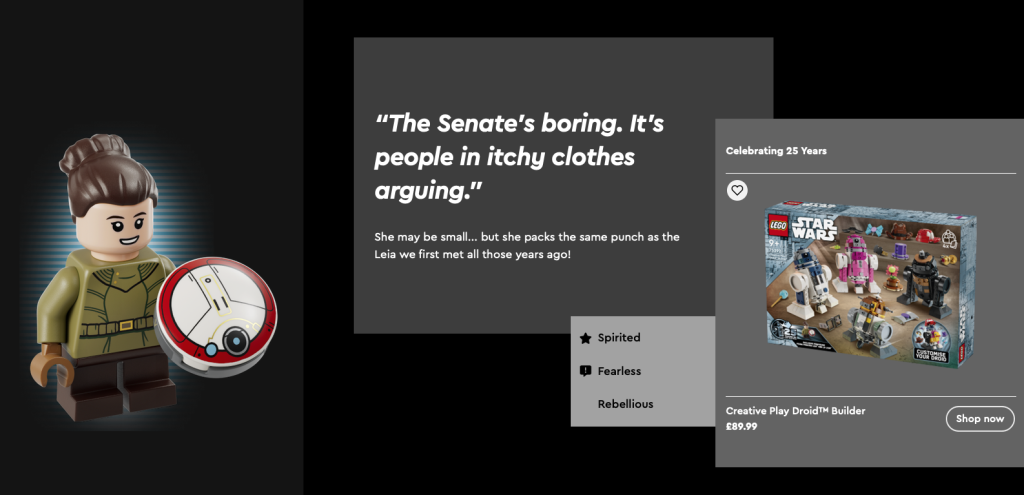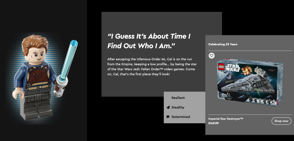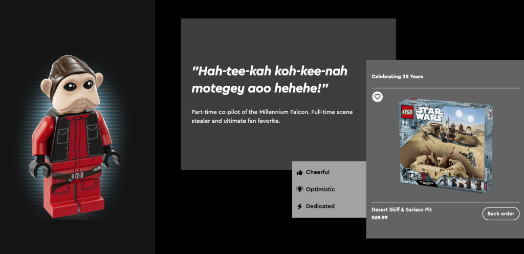 Darüber hinaus ist die LEGO Star Wars Die Landingpage zum 25. Jubiläum des Themas wurde jetzt mit vollständigen Infodateien zu jeder der neuen Minifiguren aktualisiert. Fans können eine Kurzbiografie zu jeder Figur lesen, ihre wichtigsten Eigenschaften herausfinden und sich durchklicken, um die jeweiligen Sets zu bestellen.