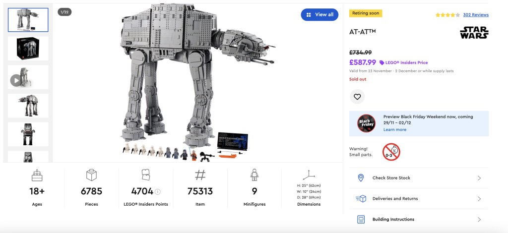 Die LEGO Das jährliche Insiders Weekend der Gruppe bietet Mitgliedern ihres Treueprogramms exklusive Rabatte, oft auch auf Sets, die anderswo selten rabattiert sind. Im Jahr 2024 waren 75313 AT-ATs darunter, deren Produktion vor ihrer Ausmusterung in weniger als zwei Monaten um 20 % reduziert wurde.