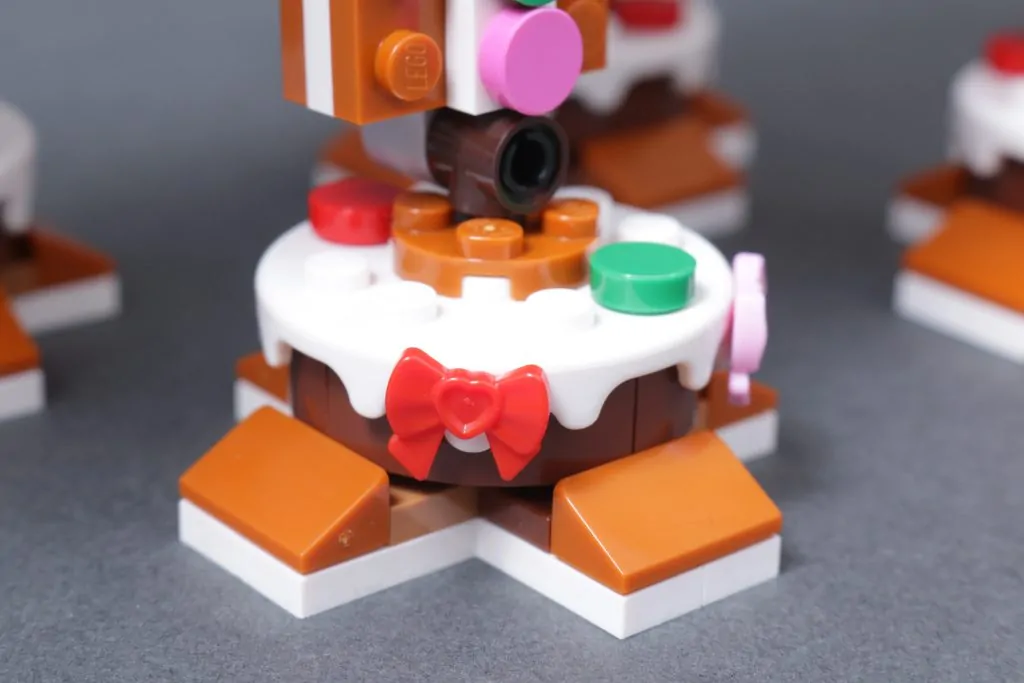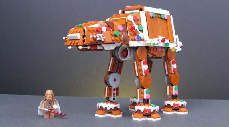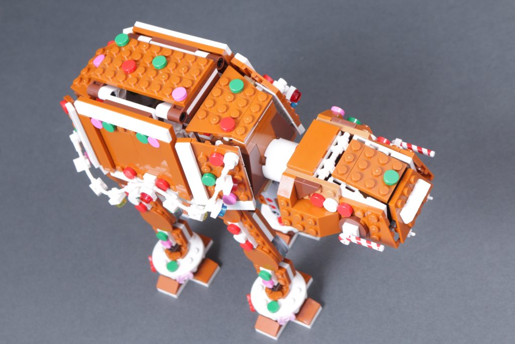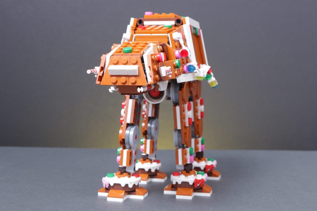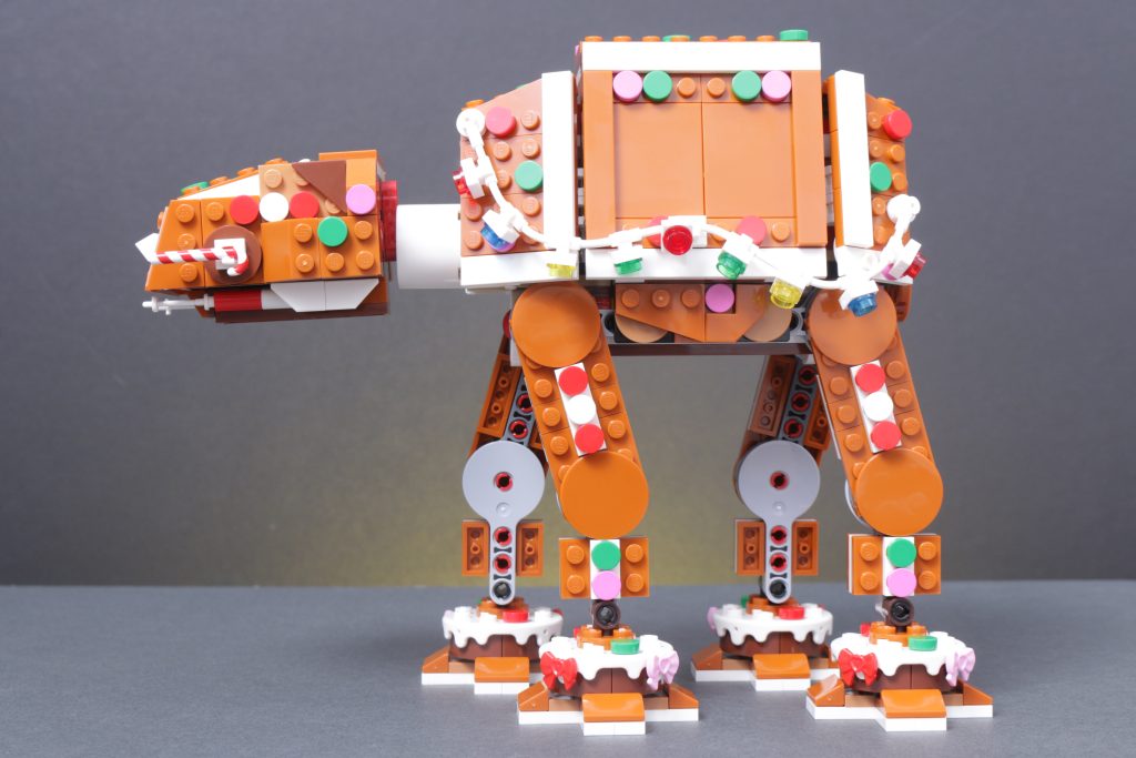 Was dieses Set bietet, ist ein verkleinerter AT-AT, der von hellgrauer Panzerung und Waffensystemen auf Dunkelorange mit weiß gefrosteter Verkleidung und mehrfarbigen Verzierungen und Süßigkeiten umgefärbt und verschönert wurde, wodurch das Aussehen und der Stil eines solchen Fahrzeugs aus einer weit, weit entfernten Galaxie nachgeahmt werden, als wäre es aus Lebkuchen.