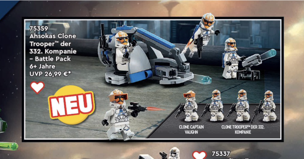 Die LEGO Der Katalog für das zweite Halbjahr 2023 ist jetzt in ausgewählten Gebieten, darunter auch in Deutschland, online verfügbar 75359 332nd Ahsoka's Clone Trooper Battle Pack is abgebildet mit einem Preisschild von 26.99 €. Das ist eine unglaubliche Summe für einen LEGO Selbst im Jahr 2023 wird es in dieser Größenordnung nichts geben, und wir verwenden den Begriff „unglaublich“ hier eher im abwertenden Sinne.