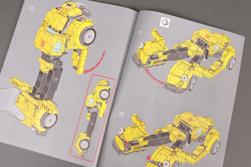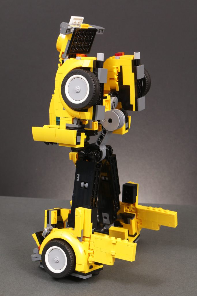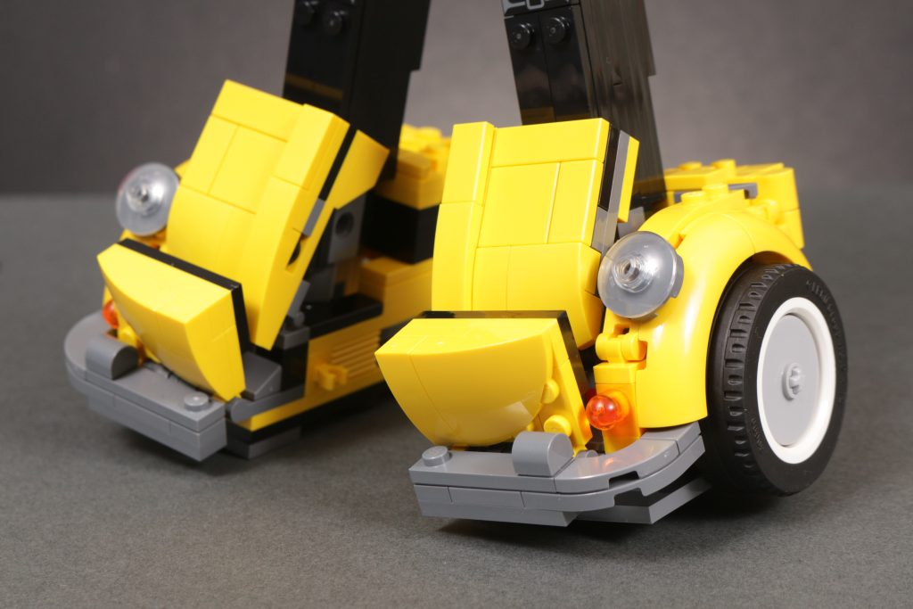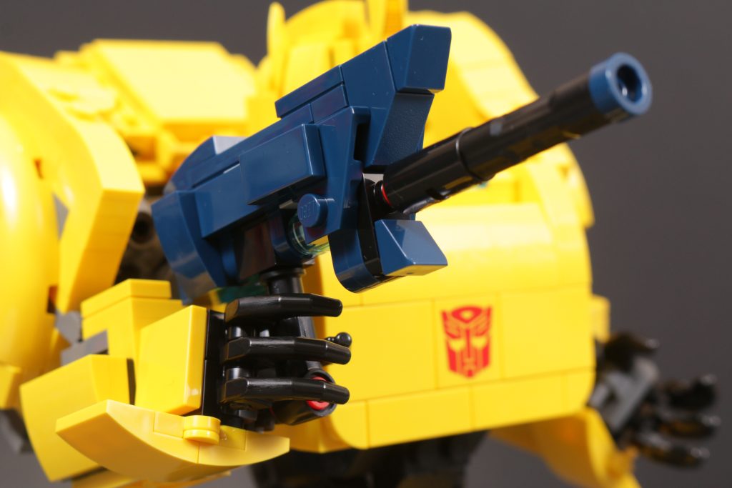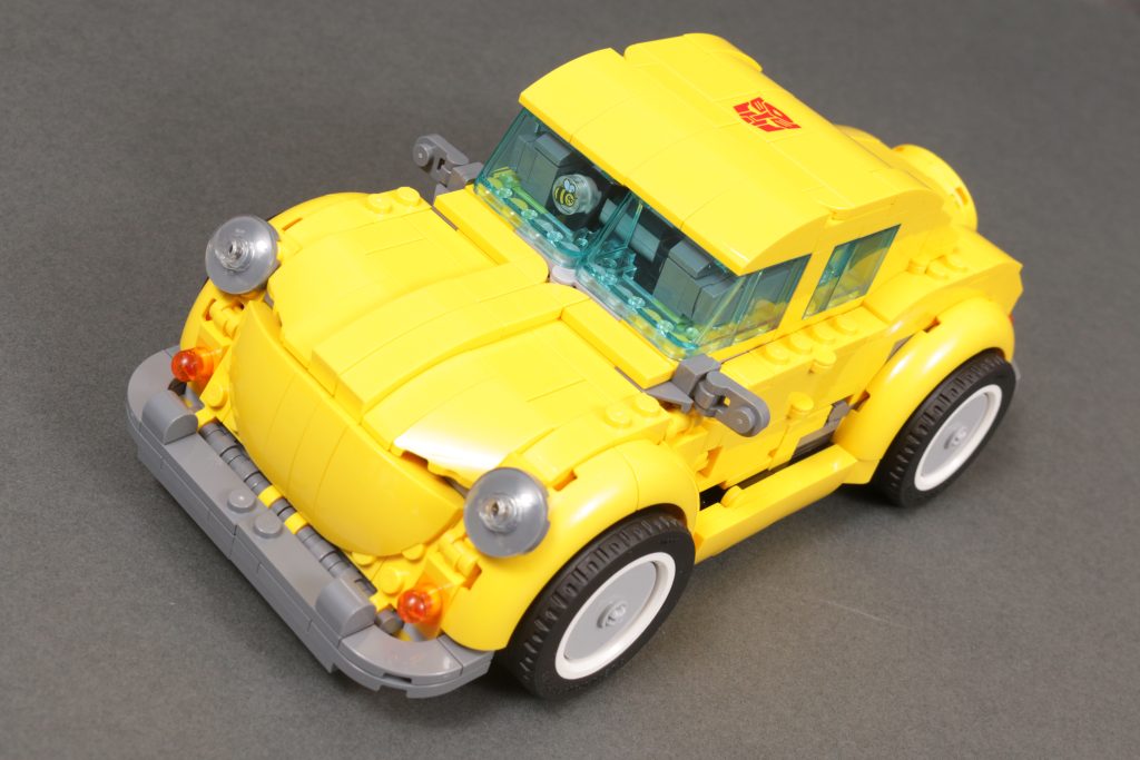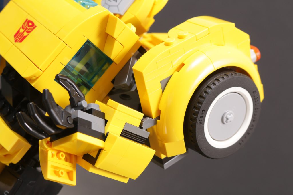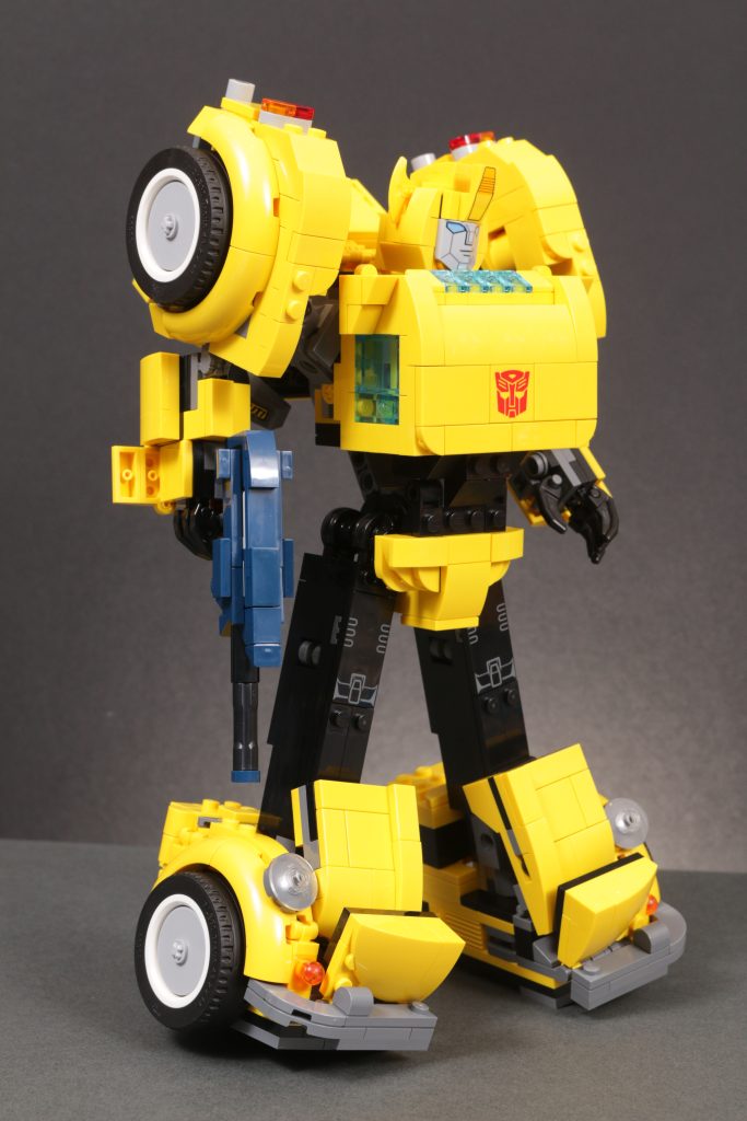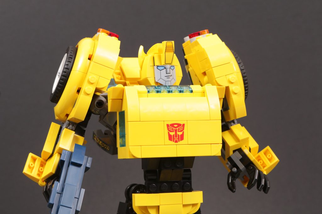 An beiden Enden der Transformation stehen zwei sehr unterschiedliche Modi für Bumblebee zur Verfügung, die beide dem Vergleich mit ihrer Leinwandinspiration aus den 1980er Jahren mehr als standhalten. Insbesondere der Robotermodus fängt die Proportionen, Farbgestaltung und Platzierung von Karosserieteilen, Rädern, Scheinwerfern usw. sehr geschickt ein, genau wie sie vor 40 Jahren in Zeichentrick- und Spielzeugform auf der Figur erschienen. Und natürlich runden das gedruckte Gesicht (und das gedruckte Autobot-Emblem) alles ab, um aus einer cleveren Konstruktion Bumblebee zu machen, wie wir ihn immer kennen – diesmal in LEGO-Form. Wie bei LEGO Optimus ist auch bei LEGO Bumblebee die Beweglichkeit wohl eingeschränkt, aber auch hier sind Struktur und Aufbau des Modells so, dass dies kein wesentliches Problem darstellt.