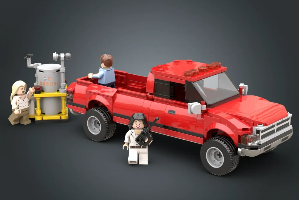 Präsentiert als Diorama ähnlich dem letztjährigen 21350 Backen, Das Twister-Projekt von RoyBauwerke Das Herzstück des Films von 1996 wird auf einer horizontalen Grundfläche eingefangen. Ein funktionsfähiger Tornado verfolgt die Sturmjäger Bill und Jo Harding in ihrem legendären roten Pickup, verwüstet den Boden – der ein Maisfeld ankündigt – und erfasst eine Kuh in seiner Spirale. Auf der Ladefläche des Trucks befindet sich außerdem eine aus Steinen geBauene Version von Dorothy, dem Prototyp des Tornado-Forschungsgeräts der Crew.