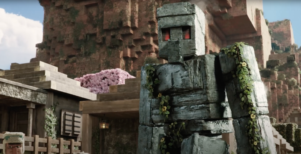 Dann gibt es schwebende Ghast, die von angreifenden Piglins als einschüchternde Heißluftballons eingesetzt werden, eine Verfolgungsjagd mit einer mit Redstone-Erz betriebenen Lore durch unterirdische Tunnel und ein Dorf, das unter einem gigantischen Steinbogen liegt.