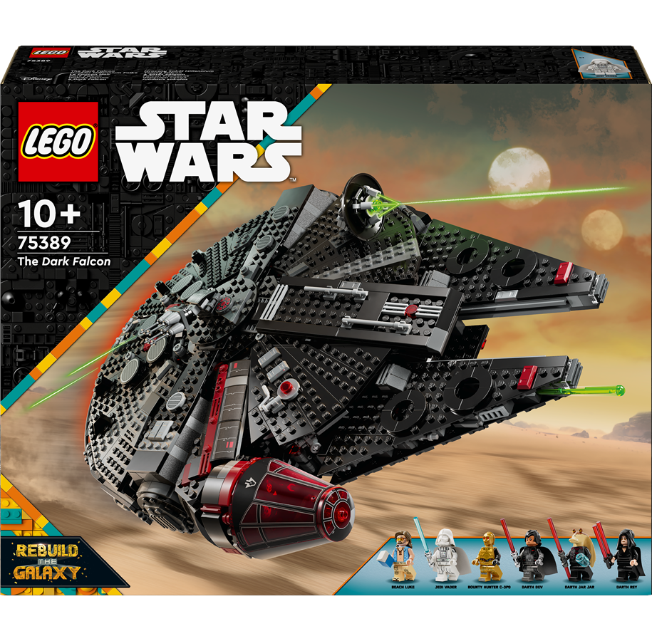 Inspiriert von Septembers Disney+ animiertes Special Rebuild the Galaxy, diese beiden Veröffentlichungen vom August 2024 bieten etwas anderes für LEGO Star Wars' konventionellste Motive: ein Millennium Falcon, ein X-Wing und ein TIE Fighter. 75389 Der Dunkle Falke stellt die helle und die dunkle Seite auf den Kopf, verpasst Han Solos Frachter einen bösen Anstrich und besetzt ihn mit Figuren wie Darth Rey und Darth Jar Jar.