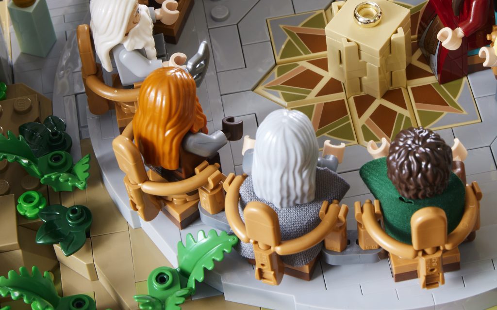 Zum Glück haben die Designer geschickt gemauerte Beine eingeBauen, die es beiden Charakteren ermöglichen, sich hinzusetzen, indem sie eine Mischung aus Scheinwerfersteinen und 1 × 1-Platten verwenden. Sie haben das gleiche für Gandalf und Elrond getan, deren Rockelemente sie sonst daran gehindert hätten, ihre Plätze im Ratsring einzunehmen. Und Sie können den Rat von Elrond nicht ohne den Oberelben selbst haben.