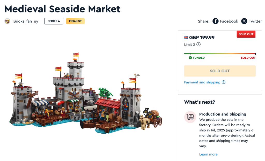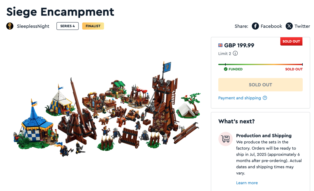 Es ist keine Überraschung, welches der fünf Sets der BrickLink Designer Program Serie 4 sich am schnellsten verkauft hat. Beide LEGO Castle-Modelle waren die ersten, die vollständig finanziert waren und innerhalb weniger Minuten jeweils 3,000 Unterstützer erreichten. Zudem waren sie die ersten beiden Sets, deren Gesamtkontingent von 30,000 Sets verkauft wurde. Tatsächlich waren sowohl „Siege Encampment“ als auch „Medieval Seaside Market“ innerhalb von vier Stunden nach Veröffentlichung ausverkauft, was einmal mehr beweist, dass bei Erwachsenen eine große Nachfrage nach neuen LEGO Castle-Sets besteht.