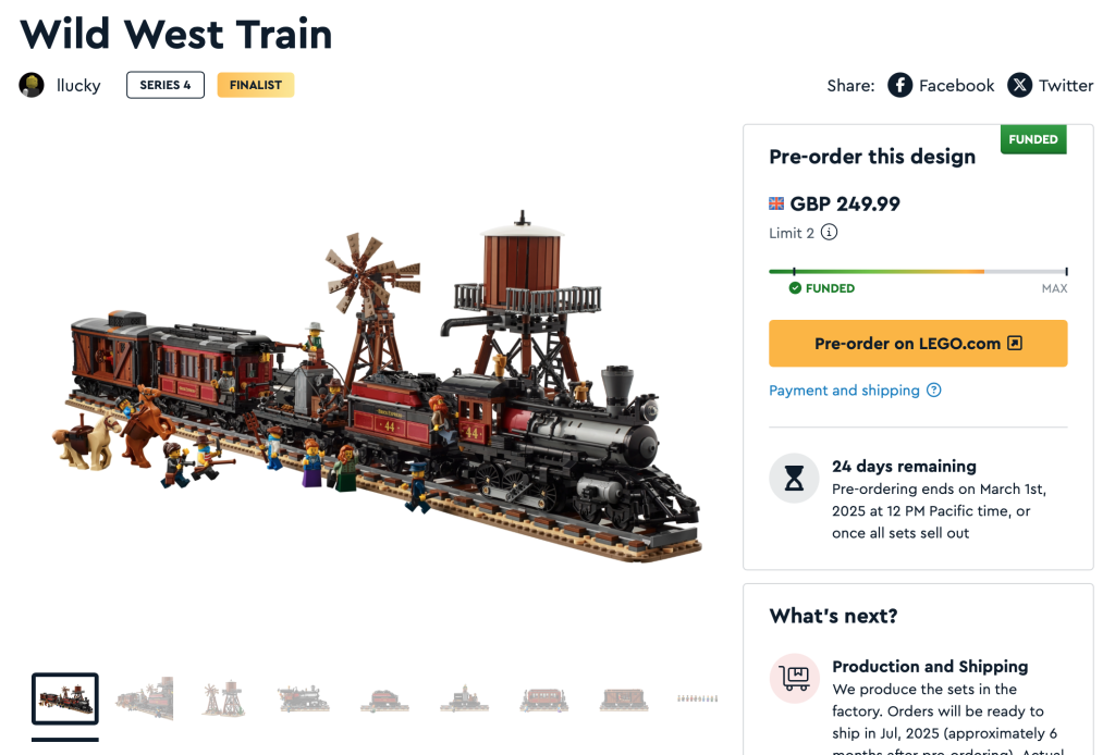 Während diese Crowdfunding-Runde größtenteils reibungslos verlief, berichteten einige Fans nördlich der Grenze von anfänglichen Problemen bei der Bestellung eines bestimmten Sets. Laut Benutzern auf reddit, konnten Kanadier den Wild West Train mindestens eine Stunde lang nicht vorbestellen, nachdem das Crowdfunding gestartet war (als ob Kanada diese Woche nicht schon genug zu tun hätte). Glücklicherweise scheint dieses Problem nun behoben zu sein – und der Vorrat ist noch vorhanden, Sie können es also jetzt erneut versuchen, wenn es gestern bei Ihnen nicht geklappt hat.