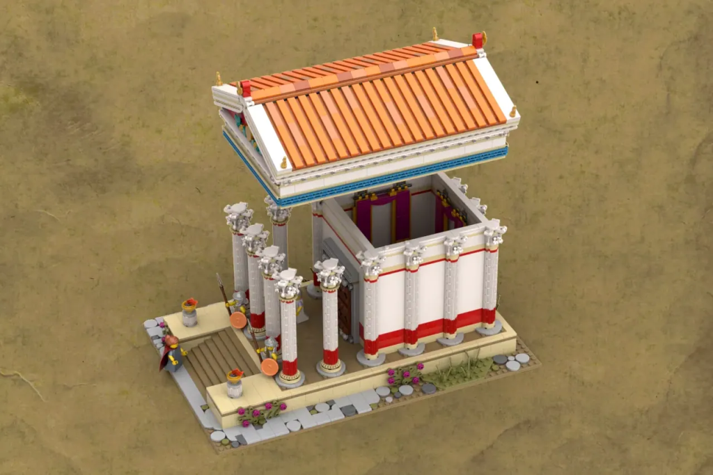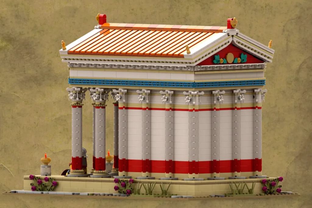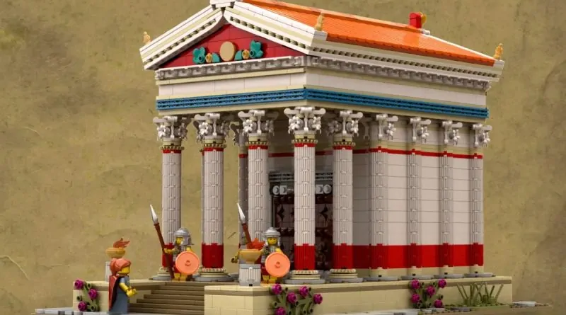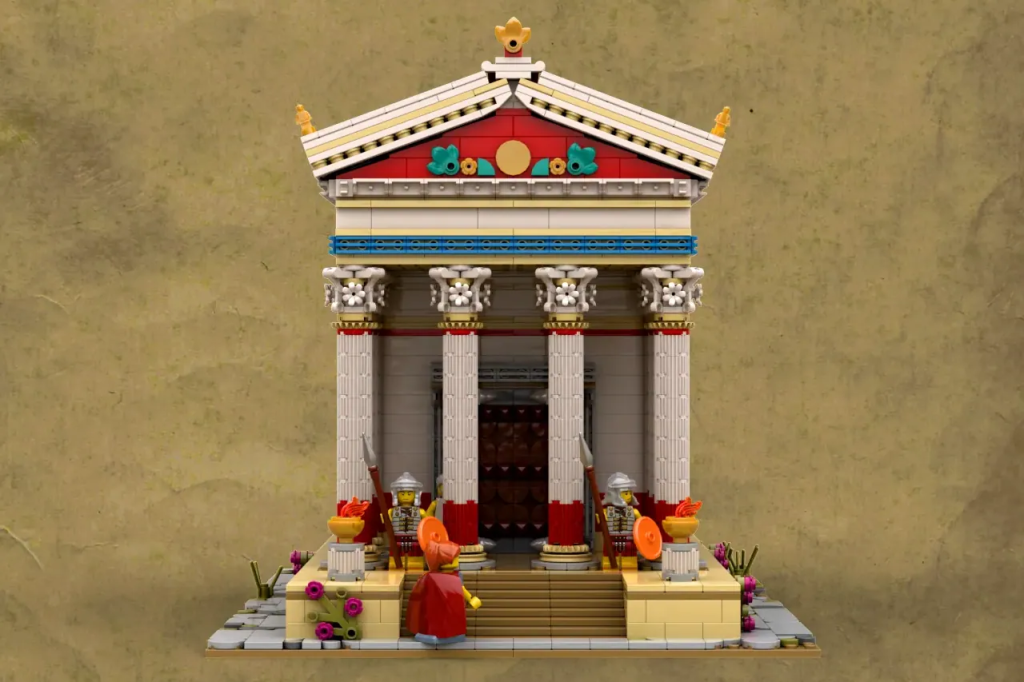 Das 2,700-teilige Modell stellt (wie Sie vielleicht schon vermutet haben) einen Tempel dar, wie er im alten Rom ausgesehen haben könnte. Es ist im Minifigurenmaßstab, modular, hat ein abnehmbares Dach und bietet Platz für vier Charaktere: zwei Wächter, einen Senator und einen Patrizier.